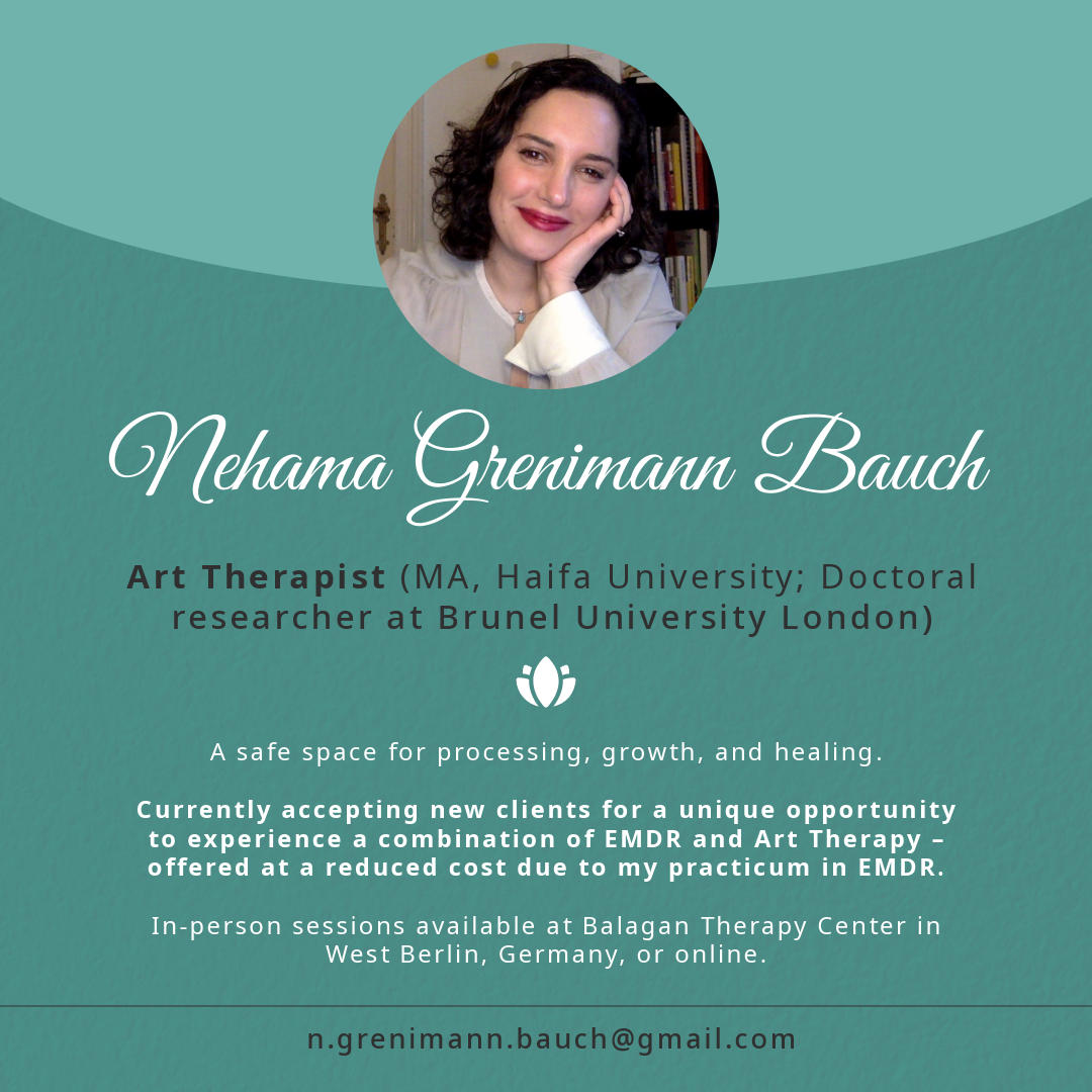 I am Nehama Grenimann Bauch, a trained art therapist (MA from Haifa University, Israel), with over 7 years of experience working primarily with children at risk, children with migration and refugee backgrounds, and their parents. In the past, I've also worked with adults in a psychiatric ward that specialized, among others, in treatment for survivors of sexual abuse. I have additional training in Mentalization-Based Arts Psychotherapies, Brief Interpersonal Arts Psychotherapies for Depression, Polyvagal-Focused and Sensorimotor Expressive Arts Therapy, Reflective Functioning Training on the Parent Development Interview, Arts-based Parental training and parental therapy, cultural humility in art therapy, and Trauma Treatment Through Art Therapy (TT-AT).